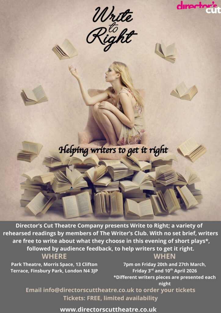 Write To Right – Director’s Cut Theatre @ Park Theatre – 27th March 2026 – Two short plays from my ‘Corrupted Souls’ series being presented in a rehesared reading. ‘Plumbline’ and ‘Widow’.
